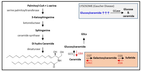 To improve our understanding of how flaws in the lysosomal fragmentation of glycosphingolipids cause lysosomal distress and subsequent pathology, the biosynthesis of glycosphingolipids is first briefly described. The key sphingolipid that serves as a building block for all complex (glyco)sphingolipids (GSL) is ceramide and a simplified scheme is depicted in Figure 3. The formation of glycosylated ceramide species including galactosylceramide and its derivative sulfatide and glucosylceramide is included [,]. The degradation of GSL occurs within the lysosome by the stepwise removal of carbohydrate moieties. In the final degradation step, acid ceramidase splits the ceramide into free fatty acid and sphingosine. Genetic defects in breakdown enzymes cause GSL accumulation within lysosomes, which drives macrophage activation. During multiple sclerosis, phagocytes ingest a high load of myelin, which consists of, among other things, sulfatide and galactosylceramide and this will increase the lysosomal GSL load as well [].