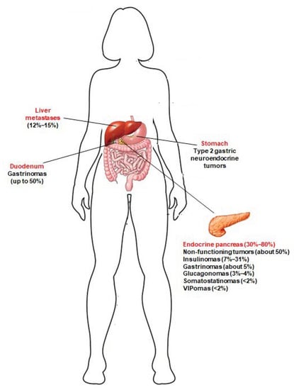 A great majority of MEN1 patients develop, during their life, multiple pancreatic microadenomas (less than 0.5 cm in diameter), mostly NF-pNETs (approximately 50% of cases) [], insulinomas (7–31% of cases) [], and gastrinomas (about 5% of cases) []. Solitary pNETs in MEN1 manifest less frequently (less than 13% of cases), usually as large masses (macroadenomas > 2 cm), and are often nonfunctional []. MEN1 pNETs manifest at a younger mean age compared to their sporadic counterparts (10–50 years vs. 50–80 years). MEN1 gastrinomas are prevalently located within the duodenum (over 90% of gastrinomas), and less than 10% of cases affect the pancreas. Glucagonomas, somatostatinomas and vasoactive intestinal polypeptide secreting tumors (VIPomas) manifest less frequently (3–4%, <2% and <2%, respectively) []. Neuroendocrine tumors affecting the gastro-entero-pancreatic tract in MEN1 syndrome are shown in Figure 1.