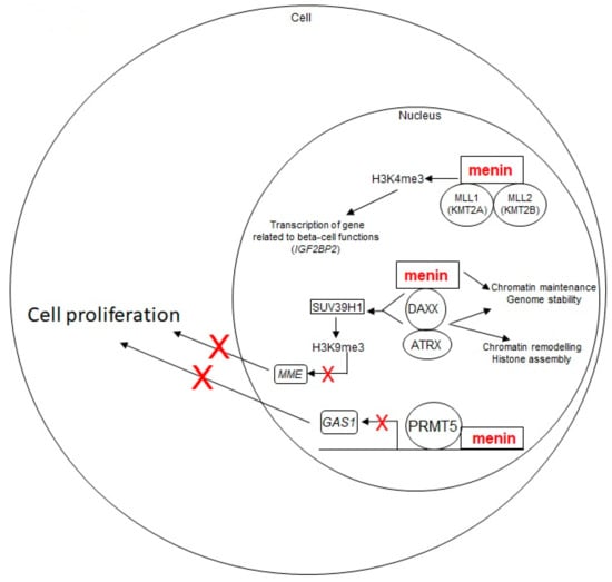 Schematic representation of menin-regulated pathways with a potential role in pNET tumorigenesis. Wild-type menin acts as a tumor suppressor for pNET development. It plays a role in chromatin remodeling and genomic stability and, via its direct interaction with the MLL1/MLL2 and DAXX-ATRX complexes, in histone methylation-driven gene transcription, and negatively regulates cell proliferation. Loss of wild-type menin results in an uncontrolled cell growth, leading to tumor development. The red X marks indicate the inhibition of a biological process (i.e., gene transcription, cell proliferation)