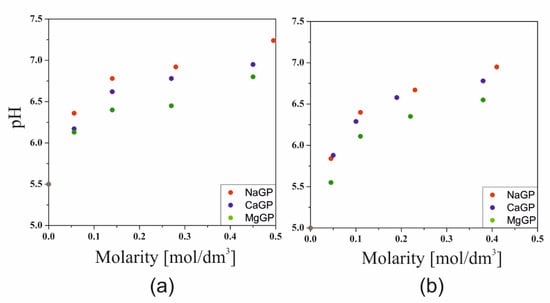 Changes in the pH value of solutions of crab chitosan chlorides (a) and acetates (b) as a function of glycerophosphate concentration. The data for the system containing the addition of calcium glycerophosphate using acetic acid come from the authors’ own research published earlier [].