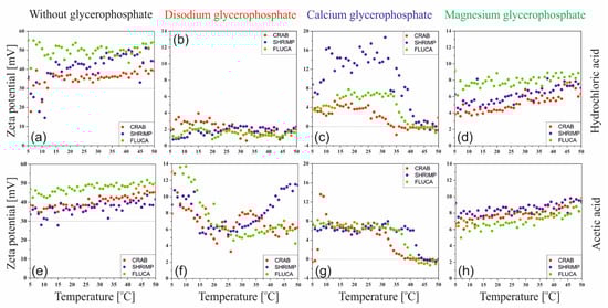 Changes in the Zeta potential value determined during heating for chitosan chlorides (a–d) and acetates (e–h) without and with the addition of various glycerophosphate salts.