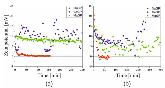 The results of the Zeta potential measurements carried out at the sol-gel phase transition temperatures are shown in Figure 3. Compared to the results of measurements carried out under non-isothermal conditions, a much larger dispersion of the obtained points is visible; this phenomenon is especially observed for the sparingly soluble calcium salt and the magnesium salt with limited solubility strongly dependent on temperature (discussed below). Regardless of the repetitions made (n = 3–5), the course of the experimental data remained unchanged.