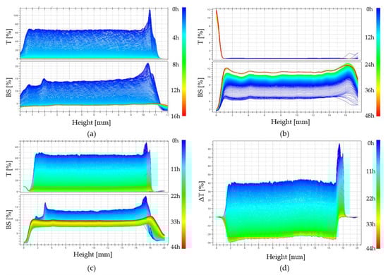 Changes in the obtained transmittance and backscatter signals are presented as parallel lines with decreasing values of the measured quantity. This proves the change in the size of particles suspended in a continuous medium (more specifically about polymer aggregation). No apparent differences at the extreme ends of the height of the tested sample proves the lack of migration of the aggregation nuclei formed, only their merging into larger structures is observed, which leads to the production of an unlimited polymer lattice.