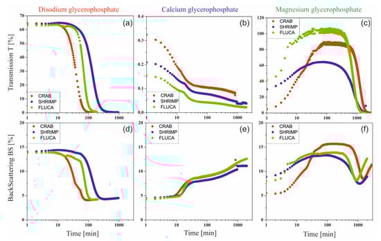 Curves of averaged transmittance (a–c) and backscatter (d–f) values obtained for a colloidal system of chitosan acetates with different molecular weights containing disodium, calcium or magnesium glycerophosphate salt.