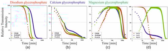 Changes in the relative intensity of transmittance for chitosan systems containing (a) sodium, (b) calcium, and (c) magnesium glycerophosphate. (d) Comparison of the relative transmission for the system obtained from crab-derived chitosan.