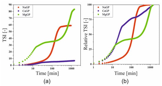 In order to take into account the total changes observed during the formation of the spatial structure, the Turbiscan Stability Index (TSI) parameter was determined, defining the total destabilization of the system, the changes of which can be successfully used to compare the course of the gelation process with the results obtained during rheometric measurements []. Based on the final TSI values (Figure 7a), it can be concluded that the greatest changes were observed in the case of the use of magnesium glycerophosphate, and the smallest in the case of the addition of calcium salt. In order to carry out a comparative analysis of the effect of glycerophosphate salts differing in cation, the values of the TSI parameter were normalized (Figure 7b).