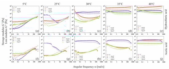 Mechanical spectra of chitosan chlorides (a–e) and acetates (f–j) containing disodium, calcium, or magnesium glycerophosphate, respectively.