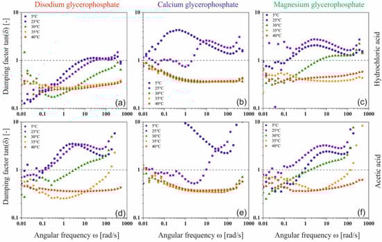 Changes in the value of the damping factor for chitosan chloride (a–c) and acetate (d–f) systems containing sodium glycerophosphate, calcium glycerophosphate, and magnesium glycerophosphate.