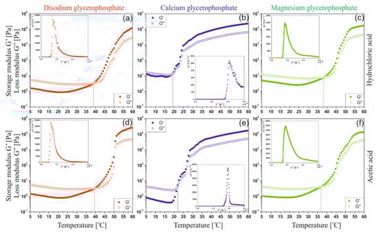 Experimental curves of changes in the values of the storage G′ and loss G″ moduli obtained during non-isothermal measurements for chloride (a–c) and acetate (d–f) chitosan solutions containing sodium glycerophosphate, calcium glycerophosphate, and magnesium glycerophosphate.