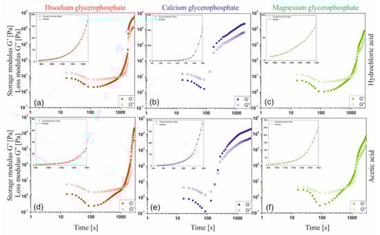 Experimental curves of changes in the values of the storage G′ and loss G″ moduli obtained during isothermal measurements at 37 °C for chloride (a–c) and acetate (d–f) chitosan solutions containing sodium glycerophosphate, calcium glycerophosphate, and magnesium glycerophosphate.