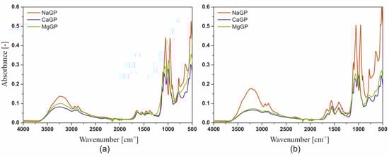 The addition of a glycerophosphate salt other than sodium into the system causes a decrease in the intensity of the peaks for the wavenumber 3293 cm−1 and 2548 cm−1 and the appearance of a new peak for the wavenumber 1125 cm−1. The latter indicates the presence of stretching vibrations of the C-O group.
