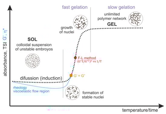 The pattern curves characteristic for a given measurement method, corresponding to actual changes in experimental parameters, indicate the presence of three characteristic regions. The first diffusion stage (for turbidimetric measurements in the perikinetic regime) or the viscoelastic flow stage (for rheometric measurements (orthokinetic)) ends with the formation of thermodynamically stable aggregation (crystallization) nuclei. The nuclei formed in this stage undergo further rapid aggregation in the second stage, the so-called fast gelation region. The differences in the course of the curves visible in the first stage result from the process regime, perikinetic or orthokinetic [].