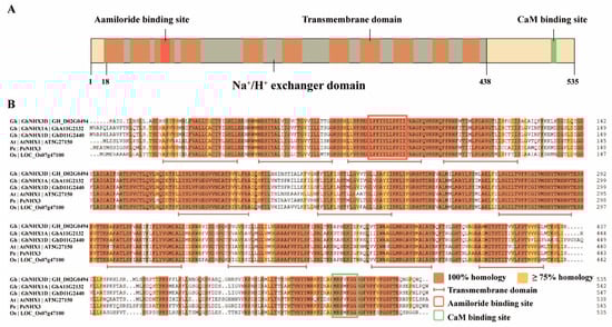 Protein sequence analysis of GhNHX3D. (A) Protein domain structure of GhNHX3D and (B) amino acid sequence alignment of GhNHX3D with vacuolar NHX proteins from other plants. The brown mark represents the predicted transmembrane domain, the red mark represents the amiloride binding site, the green mark represents CaM binding site, and the gray mark represents the Na+/H+ exchanger domain. Gh: Gossypium hirsutum; At: Arabidopsis thaliana; Pe: Populus euphratica; Os: Oryza sativa.