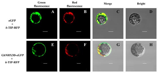 To determine the subcellular localization of GhNHX3D, the vacuolar membrane marker constructs δ-TIF-RFP and GhNHX3D-eGFP were co-expressed in Arabidopsis protoplasts (Figure 2). Microscopic observations confirmed that GhNHX3D is localized on the vacuolar membrane, consistent with the localization of HtNHX1 [] and GhNHX1A/D []. The results of the evolutionary protein structure and subcellular localization analyses indicate that GhNHX3D was located on the vacuolar membrane and belongs to the vacuolar NHX family. Therefore, we speculated that GhNHX3D has a function similar to that of vacuolar Na+/H+ antiporters and may be involved in the maintenance of the vacuolar Na+/K+ balance and other physiological processes.