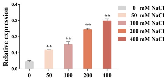 Relative transcript levels of GhNHX3D in cotton seedlings under salt stress. The salt concentration is shown on the x-axis; relative gene transcript levels are shown on the y-axis. Data are means ± standard deviation of three biological replicates. Significant differences compared with the 0 mM NaCl treatment (Student’s t-test): ** p < 0.01.