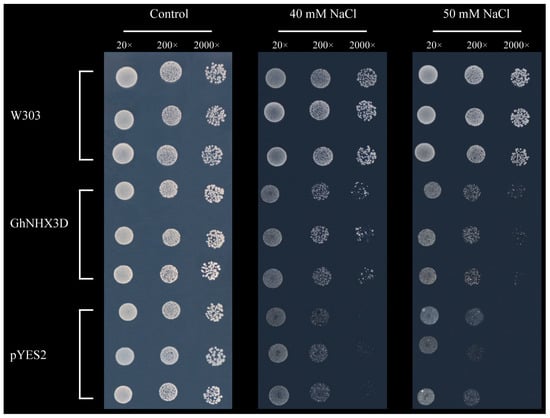 The pYES2 empty vector and pYES2-GhNHX3D were transformed into the yeast mutant strain AXT3 (ena1−4Δ: HIS3, nha1Δ:LEU2, nhx1Δ:TRP1) by the LiAc method [,], and positive clones of transformed yeast were obtained by screening. The yeast wild-type W303 (MAT: ura3-1, leu2-3, 112 his3-11, 15 trp1-1, ade2-1, and can1-100) and the strains harboring pYES2 and pYES2-GhNHX3D were cultured to a saturated state, then 10 μL of culture solution was diluted 20-, 200-, and 2000- times successively. An 8 μL aliquot of each of the diluted bacterial solutions was added to APG medium (10 mM arginine, 8 mM phosphoric acid, 2% galactose, 2 mM MgSO4, 1 mM KCl, 0.2 mM CaCl2, and trace minerals and vitamins, adjusted to pH to 5.6 with arginine) containing 0, 40, or 50 mM NaCl and cultured at 30 °C for about 5 days before photographing growth.