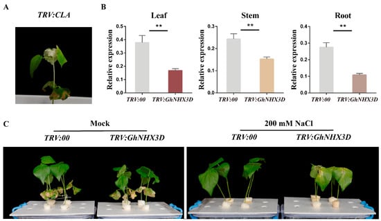 Next, we used the VIGS approach to silence GhNHX3D in cotton seedlings to investigate its potential roles in salt stress resistance, according to the previous study []. The TRV:GhNHX3D interference vector was constructed. The constructs TRV:00, TRV:CLA, and TRV:GhNHX3D were each infiltrated into the back of cotyledons of 10-day-old cotton seedlings. After 12 days (when the leaves of the positive control plant showed an albino phenotype), RNA was extracted from the leaves, stems, and roots of the cotton plants to analyze gene transcript levels (Figure 5A). As shown in Figure 5B, the transcript levels of GhNHX3D in leaves, stems, and roots were significantly lower in the silenced line than in the empty vector control. To ensure the specificity of the silencing effect, the transcript levels of GhNHX3A, a homologous gene of GhNHX3D, were also tested. The transcript levels of GhNHX3A in the leaves, stems, and roots did not differ significantly between TRV:GhNHX3D and TRV:00 plants (Figure S2). Thus, GhNHX3D was efficiently and specifically silenced in the TRV:GhNHX3D cotton plants.