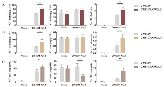 Changes in Na+ and K+ contents and Na+/K+ ratio in organs of TRV:GhNHX3D and TRV:00 cotton plants under salt stress. (A) leaves; (B) stems; (C) roots. Data are means ± standard deviation of three biological replicates. Significant differences between groups (Student’s t-test): ** p < 0.01.