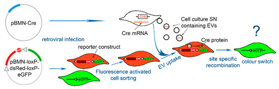 In order to distinguish between reporter cells, which have taken up functional EV cargo, the Cre-loxP system was adapted as depicted in Figure 1. Reporter cells were retrovirally infected with a construct containing a floxed dsRed cDNA, followed by a stop codon upstream of an eGFP cDNA. Upon uptake of Cre mRNA, delivered by EVs, Cre recombinase is expressed and the floxed dsRed is deleted. Subsequently, the reporter cells switch to eGFP expression as described in detail by Zomer et al. [26].