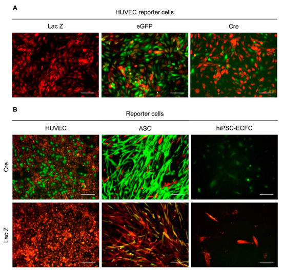 Functionality control of the Cre construct and reporter gene. (A) HUVEC reporter cells were retrovirally transduced with a control construct (lacZ), eGFP, and the Cre construct. Data presented were obtained from one experiment. (B) HUVEC, ASC, and hiPSC-ECFC reporter cells were transfected with the Cre construct and control construct (lacZ). Data presented was obtained from two independent experiments using two different donors for HUVEC and ASC and one cell donor for hiPSC-ECFC. Scale bar: 100 µm.