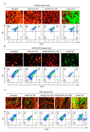 Evaluation of supernatant change from Cre+ to reporter cells. HUVEC (A), iPSC-ECFC (B), and ASC (C) reporter cells were cultured under different conditions. Reporter cells cultured in full medium were used as negative control (untreated). Furthermore, as positive control reporter cells were transfected with the Cre construct. Supernatant of HUVEC, hiPSC-ECFC, or ASC Cre+ cells were used for culturing reporter cells. Quadrant regions show the percentage of cells in each subpopulation either expressing dsRed (PE, Q1), eGFP (FITC, Q3), both (Q2), or non-fluorescent (Q4). Single green cells are indicated by the white arrows. Data presented was obtained from three independent experiments using two different donors for HUVEC and ASC and one cell donor for hiPSC-ECFC. Scale bar: 100 µm.