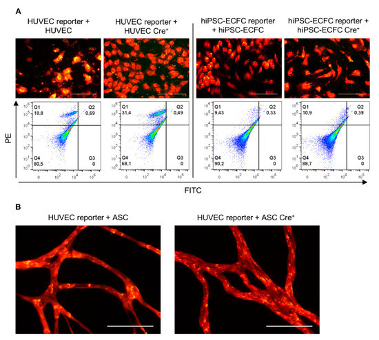 Coculture of Cre+ and reporter cells. HUVEC and hiPSC-ECFC reporter cells were either cocultured with Cre+ cells of the same cell type or ASC. (A) Cocultures of HUVEC and hiPSC-ECFC with Cre+ cells or uninfected HUVEC and hiPSC-ECFC (1:10 reporter cells: Cre+ cells). Quadrant regions show the percentage of cells in each subpopulation either expressing dsRed (PE, Q1), eGFP (FITC, Q3), both (Q2), or non-fluorescent (Q4). (B) HUVEC reporter cells were either cocultured with Cre+ or uninfected ASCs (1:50 reporter cells: Cre+ cells). Data was obtained from three independent experiments using two different cell donors for HUVEC and ASC and one cell donor for hiPSC-ECFC. n = 2 cell donors. Scale bar: 100 µm.