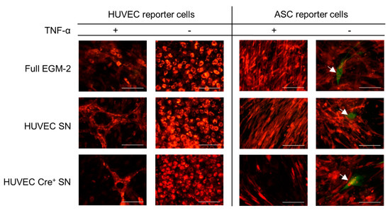HUVEC and ASC reporter cells cultured under different conditions. Reporter cells were cultured with conditioned medium (supernatant) from HUVEC or HUVEC Cre+. Furthermore, the HUVECs used for conditioned medium production were either stimulated with TNF-α (TNF-α +) or unstimulated (TNF-α -). Reporter cells cultured in full medium with or without TNF-α were used as negative control. Single green cells are indicated by the white arrows. Data was obtained from one experiment conducted in technical triplicates. Scale bar: 100 µm.