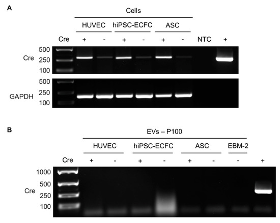 In order to confirm Cre expression in cells, RNA isolated of the individual cell types retrovirally transduced with the Cre plasmid was examined in comparison to uninfected cells (Figure 6A) of the same type and donor. Glyceraldehyde-3-phosphate dehydrogenase (GAPDH) expression was utilized as a control and was detected in all cellular samples. Furthermore, the plasmid pBMN-Cre was used as positive control (+) and H2O as a non-template control (NTC). EVs released from Cre+ and Cre− cells were obtained by ultracentrifugation (100,000× g = P100) and inquired for carrying Cre mRNA (Figure 6B). Plain endothelial basal medium (EBM-2) was used as a control. We could show that the recombinase is expressed in the retrovirally infected cells but its mRNA was not detectable in their EVs.