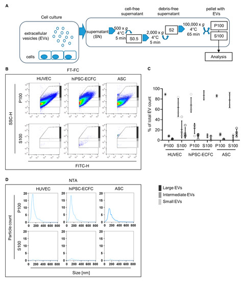 In order to investigate concentration and size distribution of EVs released by the cells used in this study, particles enriched via ultracentrifugation (Figure 7A) were analyzed using fluorescence-triggered flow cytometry (FT-FC) and nanoparticle tracking analysis (NTA) in the scatter mode. Total P100, enriched for small vesicles, show similar size distribution in all cell types when measured with NTA (Figure 7D). However, the results indicate a lower concentration of released vesicles by ASC compared to HUVEC and hiPSC-ECFC shown by the decreased number of events. Quantification of the FT-FC (Figure 7C) reveals a similar level of smaller (with means of 89% ± 1.2% for HUVEC and 86% ± 1.8% ASC) and larger vesicles (with means of 3% ± 0.4% for HUVEC and 2% ± 0.2% ASC) in HUVEC and ASC. In comparison, hiPSC-ECFC shows an increased presence of larger vesicles (mean of 8% ± 4.3%) and concurrently a decreased presence of smaller vesicles (with a mean of 69% ± 14.2%). Missing percentages to 100% were detected outside the EV gates. As a control of the enrichment procedure S100 was employed, which showed in both, FT-FC and NTA, a significantly diminished amount of events (Figure 7B,C).