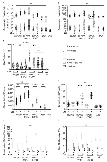 Comparison of extracellular vesicle (EV) release by HUVEC, hiPSC-ECFC, and ASC before and after retroviral transduction with the Cre construct via NTA and FT-FC. (A) Concentration (particle/mL) measured in scatter and fluorescence mode NTA showing no significant difference between the different cell types and with or without Cre expression. (B) After normalization to cell number a significant difference between hiPSC-ECFC and hiPSC-ECFC Cre+ in EVs (fluorescence) release could be detected. (C) Calculation of the ratio of EVs (fluorescence mode) and particles (scatter mode) showed a significant difference between endothelial cells and ASC. (D) Concentration (particle/mL) measured using FT-FC shows no significant difference between the different cell types and with or without Cre expression. (E) After normalization to cell number a significant difference between EC and Cre expressing EC could be detected. (F) Size distributions of EVs, analyzed via FT-FC, show no significant difference between the cell types and with or without Cre expression. (G) Percentages of CMG-stained and CD81 labeled EVs in the different size ranges (light grey, grey, and dark grey) shows an increase in CD81 positive EVs (<200 nm) released by HUVEC after TNF-α stimulation. **** = p < 0.0001, *** = p < 0.001, ** = p < 0.01, ns = p > 0.05. Error bars indicate the mean values ± SD. Data was obtained from four independent experiments. n = 2 cell donors (HUVEC, ASC) and one cell donor (hiPSC-ECFC).
