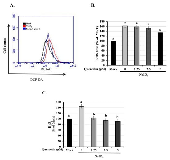 Effect of quercetin on NaIO3-mediated ROS generation in ARPE-19 cells. ARPE-19 cells were pretreated with different concentrations of quercetin (1.25, 2.5, and 5 μM) for 1.5 h and then treated with NaIO3 (6 mM) for 15 h. (A,B) Cells were labeled with the fluorescent probe, 2′,7′ dichlorodihydrofluorescein diacetate, the intracellular ROS levels were quantitatively analyzed and the mean fluorescence intensity was calculated using flow cytometry. (C) ARPE-19 cells were pretreated with different concentrations of quercetin (1.25, 2.5, and 5 μM) for 1.5 h and then treated with NaIO3 (6 mM) for 24 h. The amount of H2O2 were measured by commercial assay kits. Values represent the mean ± SD (n = 3). Data bars without letters in common (a–c) indicate a significant difference (p < 0.05).