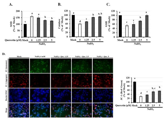 Effects of quercetin on antioxidant activity and mitochondrial dysfunction in ARPE-19 cells. ARPE-19 cells were pretreated with different concentrations of quercetin (1.25, 2.5, and 5 μM) for 1.5 h and then treated with NaIO3 (6 mM) for 15 h. The levels of (A) superoxide (SOD), (B) catalase, and (C) glutathione (GSH) were quantitatively analyzed, and the mean fluorescence intensity was calculated using flow cytometry. (D) Mitochondrial membrane potential was measured using the fluorescent probe JC-1. Loss of mitochondrial membrane depolarization (ΔΨm) was demonstrated by the change in JC-1 fluorescence from red (JC-1 aggregates) to green (JC-1 monomers). The fluorescent intensity ratio of JC-1 aggregates to monomers in treated cells. Values represent the mean ± SD (n = 3). Data bars without letters in common (a–d) indicate a significant difference (p < 0.05).