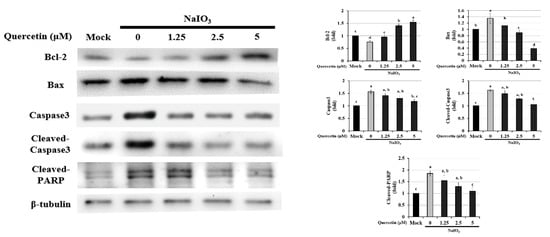 Western blotting was performed to assess the effects of quercetin on the expression of Bcl-2, Bax, caspase-3, cleaved caspase-3, and cleaved PARP in NaIO3-treated ARPE-19 cells. ARPE-19 cells were pretreated with different concentrations of quercetin (1.25, 2.5, and 5 μM) for 1.5 h and then treated with NaIO3 (6 mM) for 24 h. Data were normalized to β-tubulin. Values represent the mean ± SD (n = 3). Data bars without letters in common (a–d) indicate a significant difference (p < 0.05).