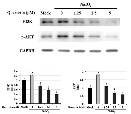 Western blotting to determine the expression of PI3K and p-AKT in NaIO3-treated ARPE-19 cells. ARPE-19 cells were pretreated with different concentrations of quercetin (1.25, 2.5, and 5 μM) for 1.5 h and then treated with NaIO3 (6 mM) for 24 h. Data were normalized to GAPDH. Values represent mean ± SD (n = 3). Data bars without letters in common (a–e) indicate a significant difference (p < 0.05).