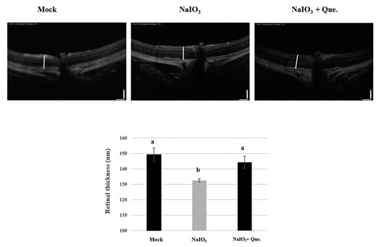 Preventive effects of quercetin on the retinal thickness of NaIO3-treated mice. Optical coherence tomography (OCT) was performed 7 days after NaIO3 treatment for all three study groups. The retinal degenerative changes are shown. Vertical bar = 100 μm and horizontal bar = 120 μm; white line represents retinal thickness. Values represent mean ± SD (n = 6). Data bars without letters in common (a,b) indicate a significant difference (p < 0.05).