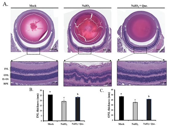 OCT is a noninvasive technique based on optical reflectivity and it is able to analyze retinal thickness and structure to produce three-dimensional, cross-sectional, retinal images []. It has been clinically adopted as the standard method to observe structural changes associated with retinopathy. In the current study, the OCT images of day 7 NaIO3-treated mice showed that their total retinal thickness was significantly lower than the mice in the mock group (Figure 6). However, quercetin treatment was shown to effectively restore the retinal thickness.