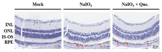 NaIO3-induced RPE degeneration has been shown to lead to the production of pigment-rich substances, and reductions in the thickness of both the outer and inner segments of the photoreceptor and the ONL [,,]. In addition, exposure of RPE cells to NaIO3 has been shown to induce a loss of their integrity and cause enlargement []. In this study, we found that the thicknesses of the total retina, INL, and ONL of NaIO3-treated mice were significantly lower compared with animals in the mock group at day 7, however, quercetin treatment could prevent the retinal degeneration caused by NaIO3 (Figure 6 and Figure 7).