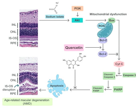 To the best of our knowledge, this is the first study to demonstrate the protective effects of quercetin on NaIO3-induced retinal degeneration in a mouse model. To conclude, we found that quercetin reduced NaIO3-induced cell apoptosis by downregulating the expressions of Bax, cleaved caspase-3, and cleaved PARP, and upregulating the expression of Bcl-2 via the PI3K/AKT signaling pathway in ARPE-19 cells (Figure 9). Moreover, in vivo experiments demonstrated that quercetin could protect against NaIO3-induced retinal damage. We believe that our results will encourage further studies on the potential use of quercetin as a treatment for AMD.