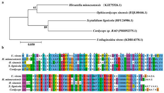 In the RNA-seq data of U. virens infecting rice spikilets [28], we found that the Uv8b_4649 gene was significantly up-regulated during the infection process (Figure S1), we speculated that it may be involved in the pathogenic process of U. virens. Uv8b_4649 (GenBank ID KDB14378.1) function annotation as a putative ester cyclase, which consisted of a 402-bp open reading frame encoding a 133-amino-acid protein. The encoded protein harbored a polyketide cyclase SnoaL domain, located between amino acids 7–127. A basic local alignment search tool for protein (BLASTP) search for SnoaL domain homologs at the NCBI database identified proteins with high similarity in other fungi, including Hirsutella minnesotensis (69.84%), Scytalidium lignicola (66.4%), Cordyceps sp. RAO (66.14%) and Ophiocordyceps sinensis (65.57%) (Figure 1a). Multiple amino acid sequence alignment showed that they had a conserved ketocyclase SnoaL domain (Figure 1b). Based on a BLASTP analysis, EC1 homologous proteins appeared to be specifically distributed in bacteria and a few fungi.