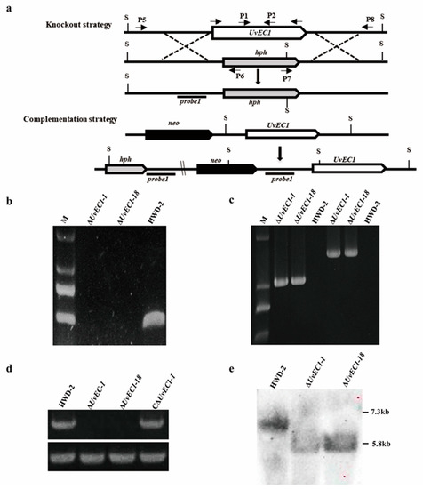 Targeted gene deletion and complementation of UvEC1 in U. virens. (a) Knockout and complementation strategies for UvEC1. (b–d) RT-PCR analyses of UvEC1 expression in UvEC1 mutants and complementation strains. (e) Southern blot analysis of HWD-2 and ΔUvEC1 mutants.