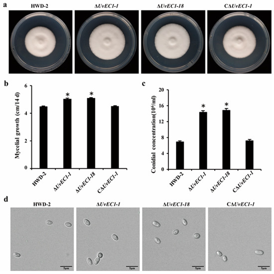 As compared to the wild-type strain HWD-2, the ∆UvEC1 mutants exhibited a significantly higher mycelial growth rate (Figure 3a,b), although an examination of mycelial morphology under the microscope showed no apparent differences between ∆UvEC1 mutants and HWD-2. Conidiation was significantly increased in ∆UvEC1 mutants relative to the wild-type strain, but mutant conidia appeared morphologically normal (Figure 3c,d). These results indicated that UvEC1 plays important roles in the vegetative growth and conidiation of U. virens.