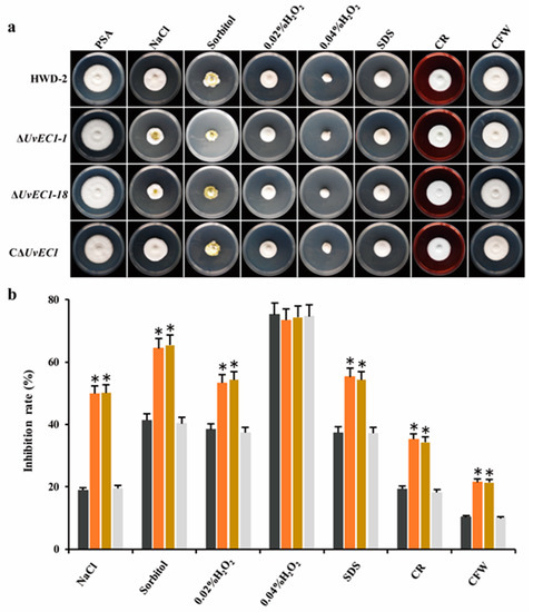 Sensitivity of ∆UvEC1 mutants to various stresses. (a) Colony growth of HWD-2, UvEC1 mutants and the complementation strain on PSA medium containing various stress inducers after 14 days at 28 °C in the dark. (b) Rates of growth inhibition of colonies by the stress inducers shown in a. Asterisks represent significant differences relative to HWD-2, as determined by LSD at p = 0.05.