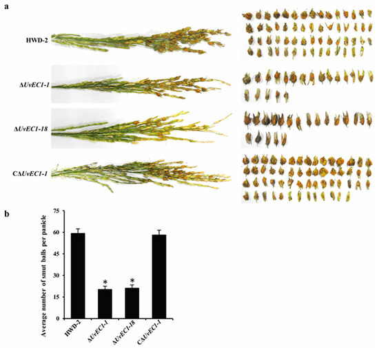 2.5. Deletion of UvEC1 Affects the Pathogenicity of U. virens