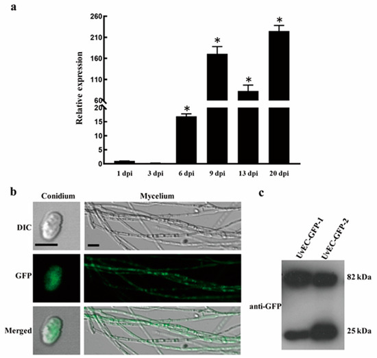 We next examined the relative expression of UvEC1 over the course of the infection process by U. virens using RT-qPCR, using samples from infected spikelets collected at 1, 3, 6, 9, 13 and 21 dpi (Figure 6a). We found that UvEC1 is highly expressed at 9 dpi and 20 dpi, with a 2- to 3-fold drop at 13 dpi. These results suggest that UvEC1 is differently expressed during the infection process and is likely important for the pathogenicity of U. virens.