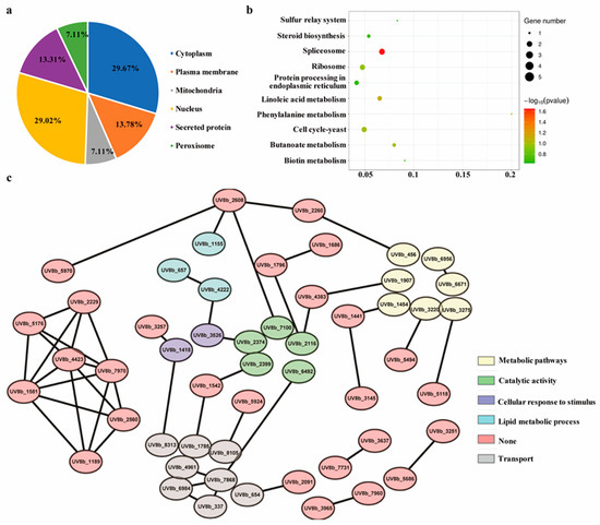 We performed a quantitative proteomics analysis to identify differentially accumulating proteins (DAPs) between HWD-2 and the ∆UvEC1-1 mutant, resulting in a list of 3967 proteins across three independent biological replicates based on our selection criteria for identification (Table S2). We observed high correlations across all replicates for a given genotype, confirming the quality of our dataset (Figure S2a). We independently validated the quality of the dataset by calculating the mass errors for enriched peptides. Most mass errors measured were smaller than 10 ppm, indicating a high degree of accuracy in the mass spectrometry (MS) data (Figure S2b). The lengths of most identified peptides varied from 7 to 20 amino acids (Figure S2c). Based on tandem mass tag (TMT)-based quantitative proteomics, we considered proteins with a fold change over 1.2 and a p-value lower than 0.05 as DAPs, when comparing their abundance between the mutant and the wild-type strain HWD-2 (Table S3). Volcano plot and heatmap analysis showed that 145 and 88 proteins were more and less abundant, respectively, in the ∆UvEC1-1 mutant (Figure S3a,b). We performed in silico subcellular compartment predictions and discovered that among the 233 DAPs, most localized to the cytoplasm (29.7%), nucleus (29.0%), mitochondria (7.1%) or plasma membrane (13.8%), were secreted proteins (13.3%) or localized to the peroxisome (7.1%) (Figure 7a). Gene ontology (GO) enrichment analysis indicated that under the category of biological processes, DAPs were mainly associated with metabolic process, single-organism process and localization (Figure S4). In terms of molecular functions, DAPs were mostly related to binding, catalytic activity and transporter activity (Figure S4). In agreement with our subcellular compartment predictions, DAPs were mainly enriched in cell, organelle part, membrane and extracellular region terms from GO cellular components (Figure S4). Notably, Kyoto Encyclopedia of Genes and Genomes (KEGG) pathway enrichment analysis of DAPs revealed the spliceosome as a significantly enriched functional category (Figure 7b). We generated a protein interaction network of all DAPs based on the STRING database. DAPs formed a highly interconnected protein network. Several complexes and cellular functions established prominent and highly connected clusters, including metabolic pathways, catalytic activity, cellular response to stimulus, lipid metabolic process and transport (Figure 7c).