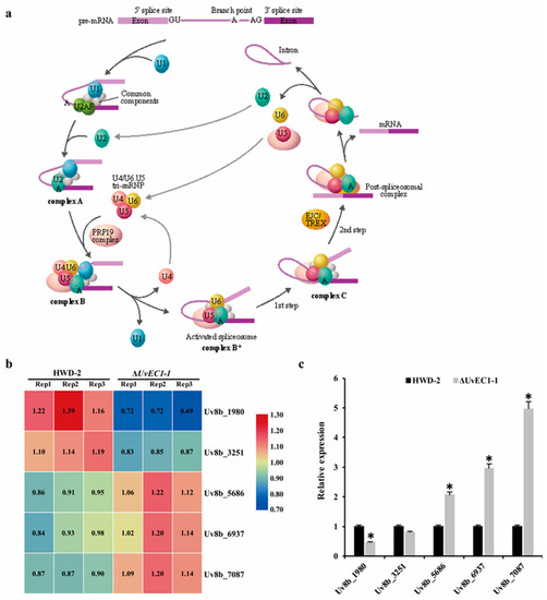 Most eukaryotic genes are expressed as precursor mRNAs (pre-mRNAs) that are converted to mRNA via splicing, an essential step of gene expression during which noncoding sequences (introns) are removed and coding sequences (exons) are ligated together. Pre-mRNA splicing is catalyzed by the spliceosome, a multi-megadalton ribonucleoprotein (RNP) complex comprised of five small nuclear RNPs (snRNPs) and numerous proteins. The U2-dependent spliceosome is assembled from the U1, U2, U5 and U4/U6 snRNPs and multiple non-snRNP proteins (Figure 8a). During the splicing reaction, a variety of protein-nucleic acid complexes and splicing factors are combined and depolymerized in a highly precise sequence to form a pre-assembled complex U1, U2, U5 and U4/U6. Among our DAPs, we identified five proteins involved in the spliceosome: Uv8b_1980 (U5 snRNPs), Uv8b_3251 (U6 snRNPs), Uv8b_5686 (U1 snRNPs), Uv8b_6937 (U2 snRNPs) and Uv8b_7087 (U4 snRNPs) (Figure 8b). Based on RT-qPCR, these genes displayed altered relative transcript levels in the ∆UvEC1-1 mutant compared to the wild type HWD-2 (Figure 8c). These results suggest that UvEC1 play a role in the spliceosome.
