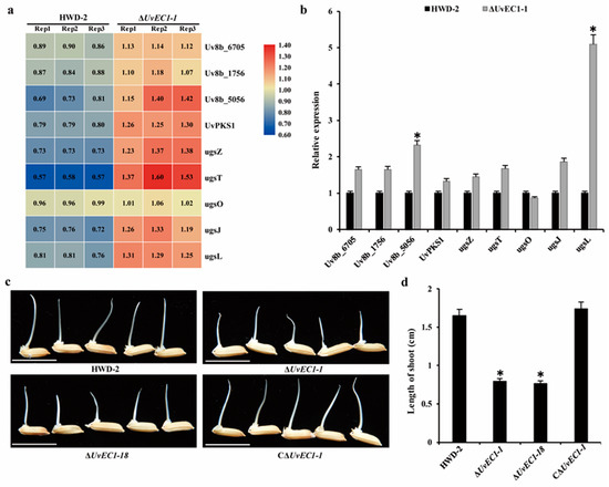 Deletion of UvEC1 affects the protein accumulation and expression of toxin-encoding genes. (a) Heatmap analysis of levels of toxin-biosynthesis-related proteins in the ∆UvEC1-1 mutant and HWD-2. (b) RT-qPCR analysis of toxin-biosynthesis-related genes in HWD-2 and ∆UvEC1. β-tubulin was used as reference gene. (c) Reduced inhibition of rice seed germination by culture filtrates of the ∆UvEC1 mutants. Shoot lengths were measured after 5 d at 28 °C under illumination in growth incubators. (d) Mean length of rice shoots treated with filtrates from the indicated cultures. 50 rice seeds were shifted to 25-mL culture filtrates at 28 °C for 5 d. Three independent experiments (n = 100) were carried out (mean ± SD), bar =10 mm. Asterisks represent significant differences relative to HWD-2, as determined by LSD at p = 0.05.
