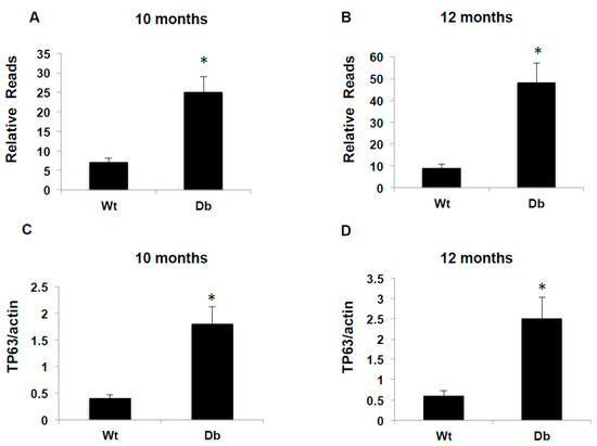A Significant increase in RNA reads and tumor protein 63 (TP63) mRNA in diabetic mice. Kidney tissues from WT and diabetic mice were homogenized, and the total RNA was extracted. RNA reads were measured by RNA sequence in 10-month-old (A) and 12-month-old (B) mice. (C,D) mRNA of TP63 quantitation was performed by qRTPCR showed higher expression in diabetic mice compared to WT mice. A significant difference from WT mice is indicated by * p < 0.01.