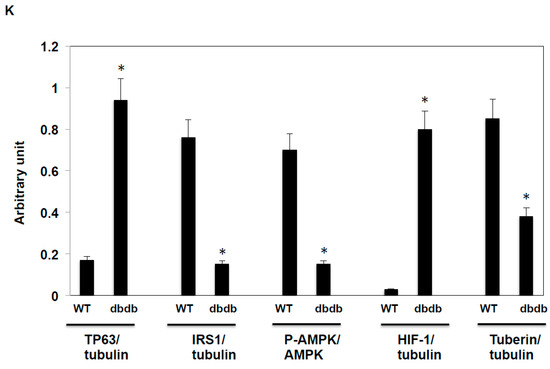 Kidney cortices from WT and db/db mice were homogenized, and the lysates were subjected to Western blot analysis. The downregulation of IRS-1 expression is correlated with the upregulation of TP63 in diabetic mice, as compared with WT mice, at both 10 and 12 months of age (Figure 2G,I). Next, we measured the expression levels of genes downstream from IRS-1 in kidney tissue homogenates from WT and diabetic mice, using Western blot analysis (Figure 2G,I,K). In contrast, the expression of HIF1a, also downstream from IRS-1, is significantly increased in diabetic mice (Figure 2H,J,K). These data suggest a key role for TP63 in the regulation of the IRS-1/p-AMPK/tuberin/HIF1a pathway in the diabetic kidney.