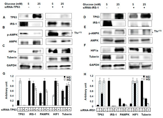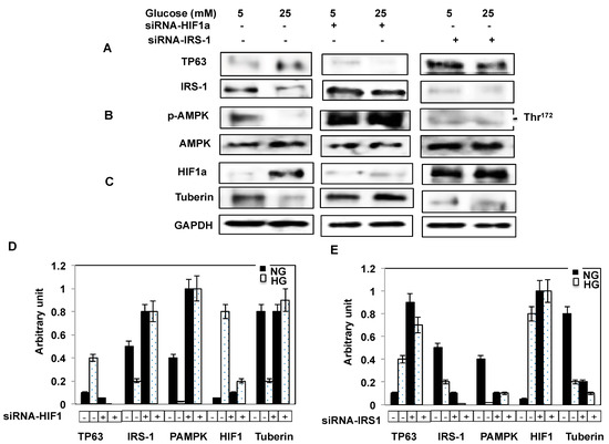 Our immunohistochemical data indicated that TP63 levels are increased in the kidney tubular cells of diabetic mice. To identify the mechanisms through which TP63 may regulate IRS-1, murine proximal tubular epithelial (MCT) cells were transfected with siRNA-TP63 under NG or HG conditions. The downregulation of TP63 by siRNA-TP63 resulted in significant increases in IRS-1, p-AMPK, and tuberin protein levels and a decrease in HIF1a protein expression under NG and HG conditions (Figure 3A–C), compared to non-transfected cells by Western blot analysis. These data suggest that TP63 might be a target of IRS-1/p-AMPK/tuberin/HIF1a pathways.